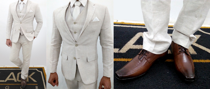 Dependerá do traje que a noiva usará. Muitas vezes, em uma praia, pode ser necesário um traje ainda mais leve que o social, caindo quase em um esporte fino. Mas aqui trataremos deste coringa para o dia. Não tem erro, o linho areia alivia qualquer calor excessivo.